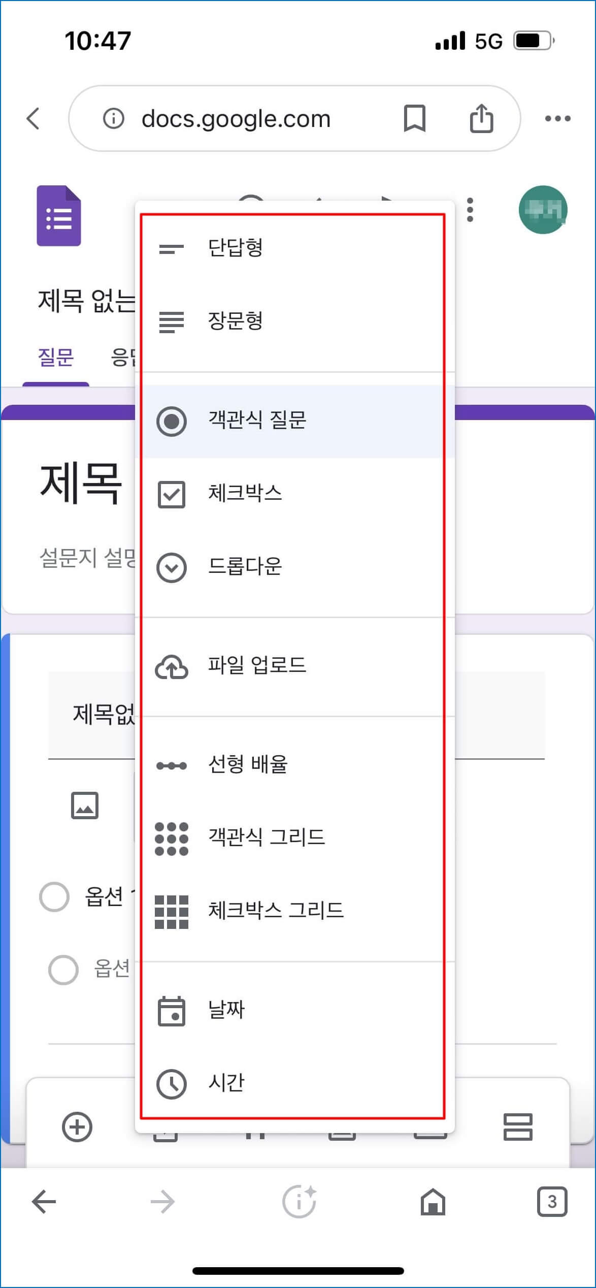 - 객관식질문: 가장 일반적인 형태이며, 객관식으로 질문을 만들 수 있습니다.